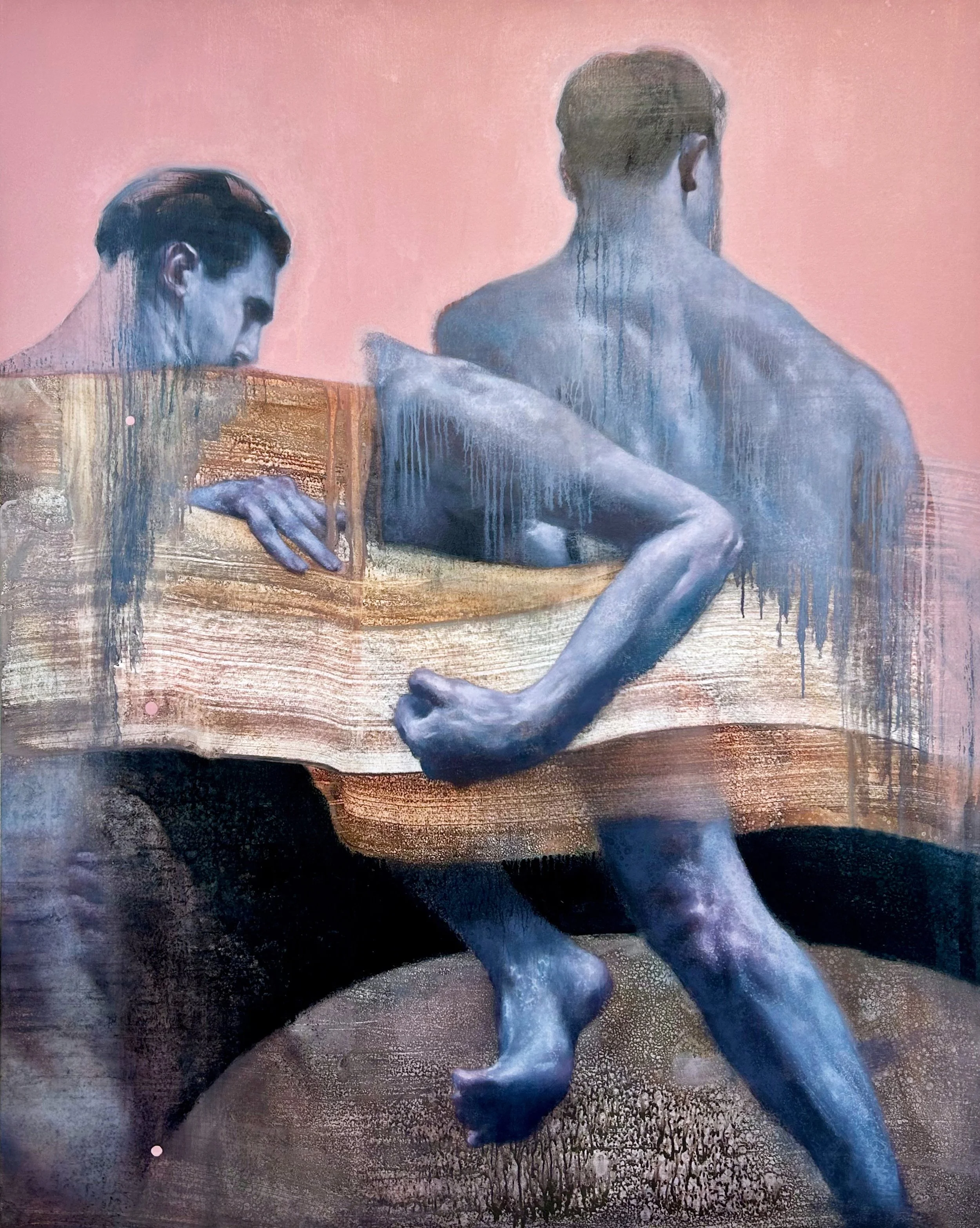 His practice is rooted in a process-driven approach, where the act of painting itself becomes a site of experimentation. Through layering, removal, and reconstruction, Kostov creates surfaces that reveal traces of their own making, emphasising the physicality of the medium. This iterative method results in works that feel both constructed and unstable, balancing deliberate gesture with unpredictable outcomes.